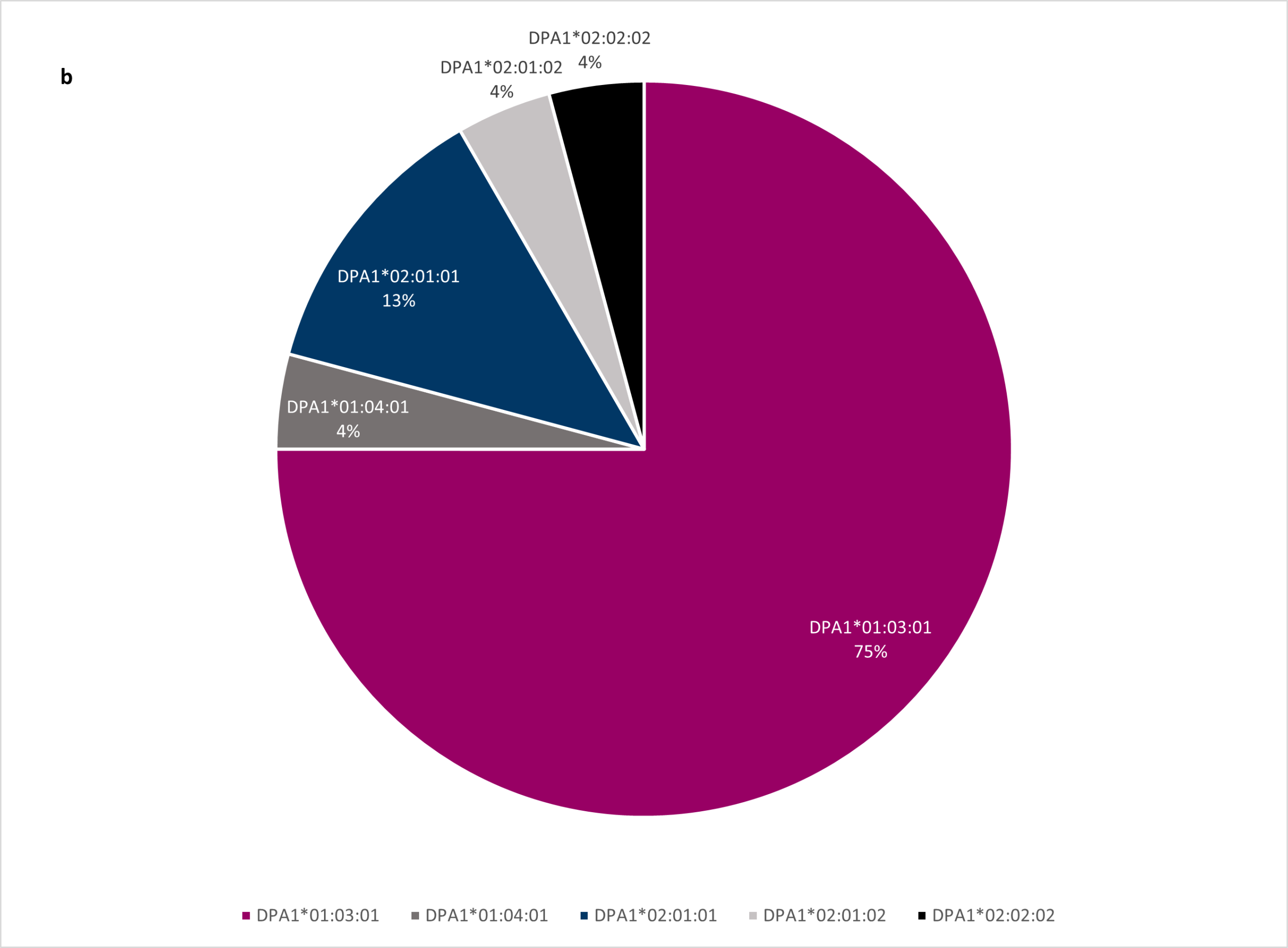 The HLA-DPA1 locus is the least polymorphic HLA locus; this was confirmed in the project as 75% of all HLA-DPA1* alleles were DPA1*01:03:01 (Figure 1b).