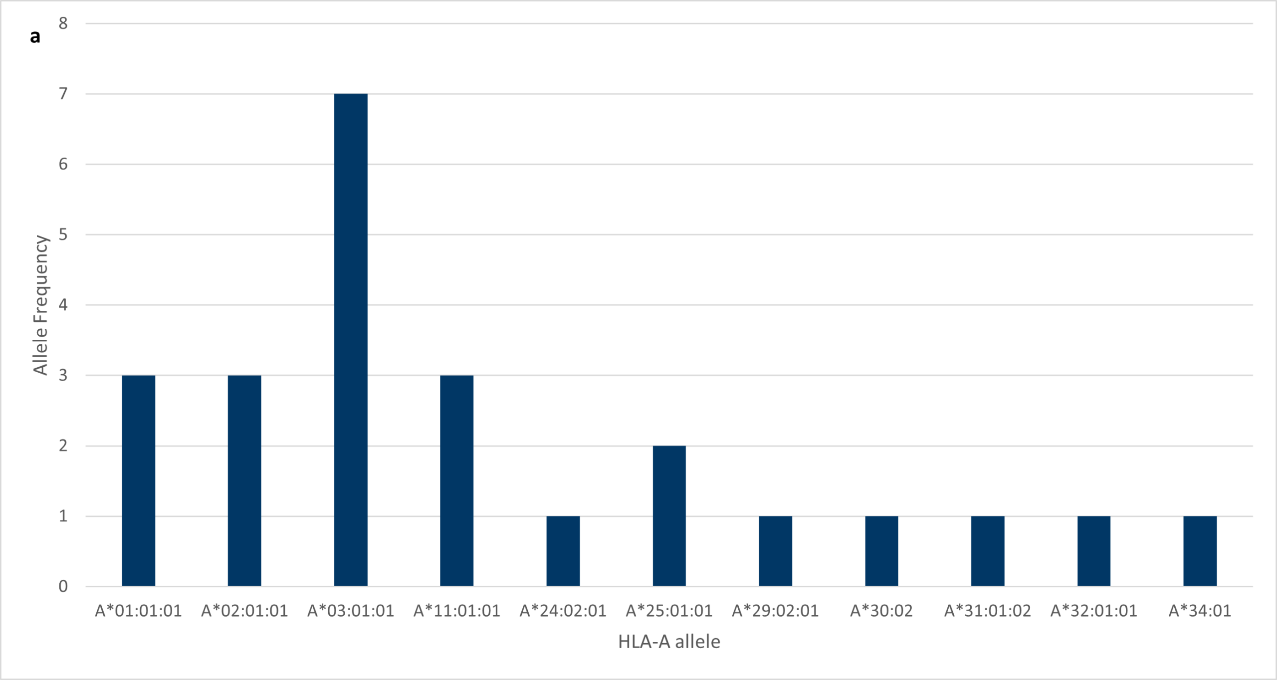 Analysing the results from the project confirmed the earlier statement with regards to HLA polymorphism; VH Bio’s cohort of employees was very polymorphic. A*03:01:01 was the most frequent of the HLA-A alleles, with seven individuals expressing this allele (Figure 1a). Before the project, I would have guessed that A*02:01:01 would be the most common HLA- A allele to be found in our company cohort because it’s the most common HLA-A allele worldwide with a frequency of approximately 50%.