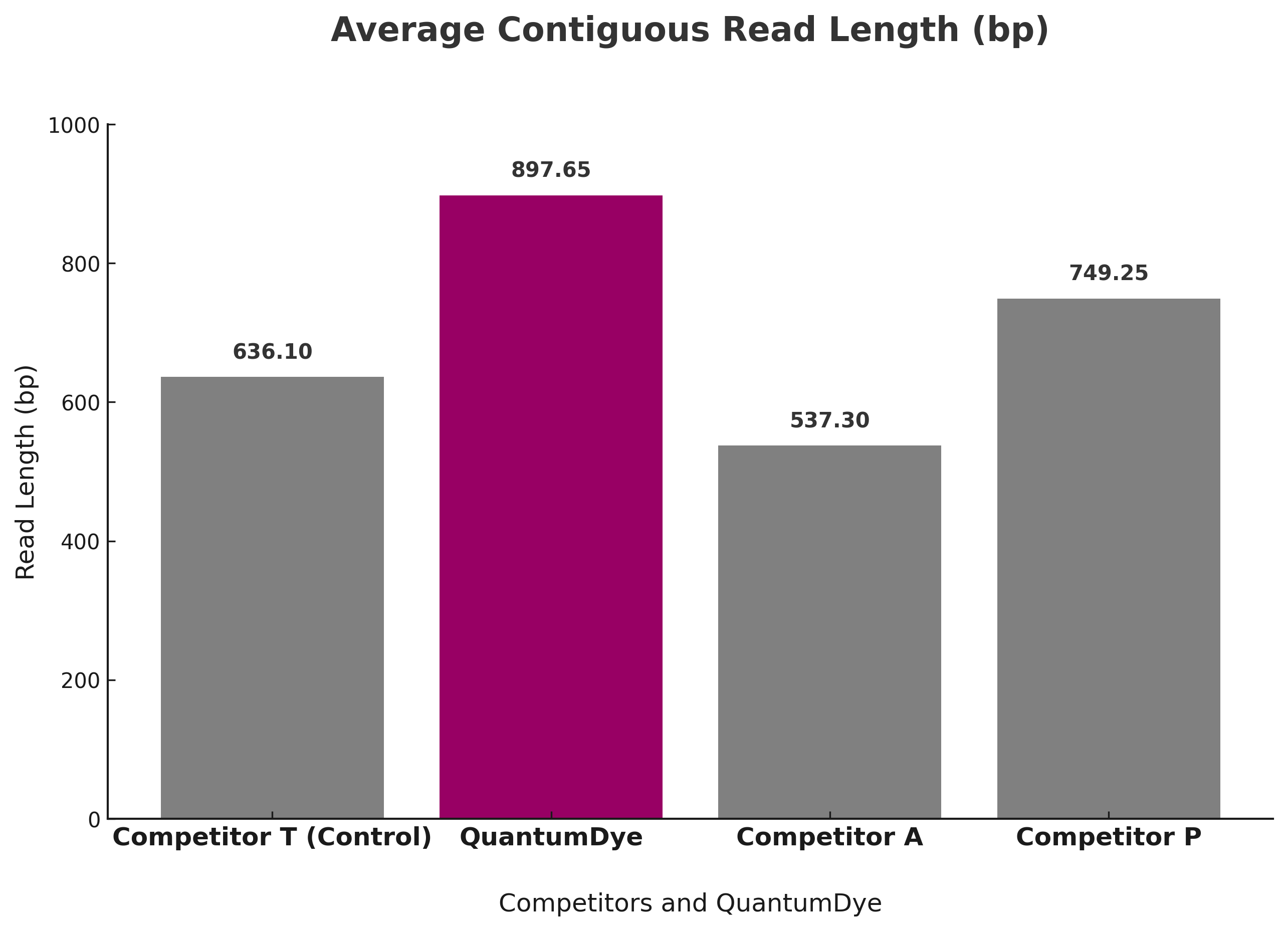 This chart compares the average contiguous read lengths achieved by QuantumDye and leading competitors, derived from sequencing data generated using 20 distinct primer pairs across a range of target sequences. Longer contiguous read lengths indicate higher sequencing accuracy and efficiency, critical for applications requiring high-quality data. QuantumDye achieves significantly longer read lengths (897.65 bp), outperforming all competitors, making it the optimal choice for precision-demanding workflows.